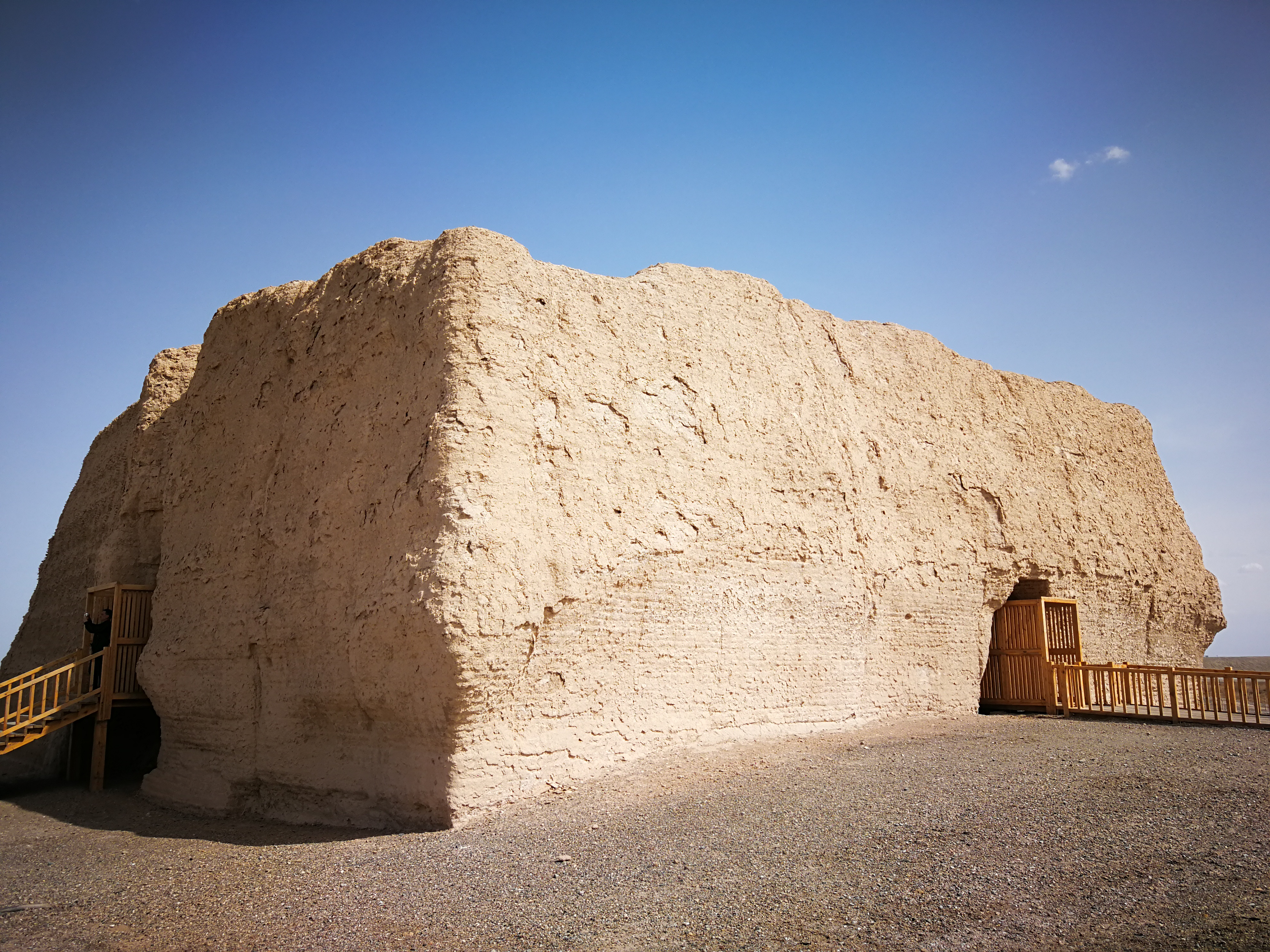 俯视脚下的城楼,练兵场,跑马院仍然可以依稀感受得到当年森森威严的气息。城墙上的龙旗随风飘荡,眺望远方祁连雪山若隐若现,不禁感觉到些许的寒风刺骨。再往北望去,四海之内一片萧瑟。我想如果不是这座关城,雄踞宇内的中原文明不知道要被草原民族冲击成个什么模样。也正是因为有了这一座关城,也许才有繁荣了几个世纪的丝绸文明吧。看完了关城我们来到了天下第一墩——长城第一墩即长城之上的第一座烽火台。这座孤零零的烽火台从远处看像一座不起眼的土堆,但走近一看才发现,原来它耸立在了高百余米的悬崖峭壁上,仿佛现在还能看出当年它傲视天下的巍峨气势来,油然而生敬意。