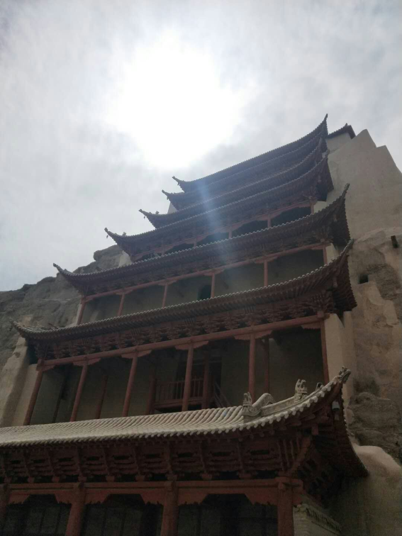 星期六的早晨我们带着愉悦的心情,背着行囊,浩浩汤汤的从西安火车站出发了,尽管要坐一天一夜的火车,一路上大家还是兴致勃勃的。第二天早上八点多我们到达敦煌,天气阴沉沉的,降雨量那么少的敦煌难得飘了场小雨。早上短暂的休息过后导游就带我们去了莫高窟。莫高窟,俗称千佛洞,坐落在河西走廊西端的敦煌。它始建于十六国的前秦时期,历经十六国、北朝、隋、唐、五代、西夏、元等历代的兴建,形成巨大的规模,有洞窟735个,壁画4.5万平方米、泥质彩塑2415尊,是世界上现存规模最大、内容最丰富的佛教艺术地。印象最深的是第96号窟,是当地小学的一位小小讲解员为我们介绍的,此窟开凿于初唐,窟内的大佛高35.5米,两膝间宽度为12米,是莫高窟的第一大佛。根据敦煌遗书《莫高窟记》记载,这尊大佛为唐代武周证圣元年(695年)由禅师灵隐和居士阴祖所建。是佛国三世中的“未来佛”弥勒佛,即释迦牟尼的“接班人”。大佛的制作方法为石胎泥塑,即在崖壁的石沙岩体上凿出佛像的大体形状,再用草泥垒塑、用麻泥细塑,最后着色而成。这尊大佛因多次重修,已非唐塑原貌,但仍不失雄伟壮观的气势。窟前的建筑为九层楼,因其共有九层而得名,原为四层,晚唐(874~879)年间建成五层,宋初(966年)重修,九层楼是1935年建造,它攒尖高耸,檐牙错落,铁马叮咚,已成为莫高窟的标志之一。
