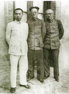 1937年林伯渠(右一)与周恩来、博古在七贤庄