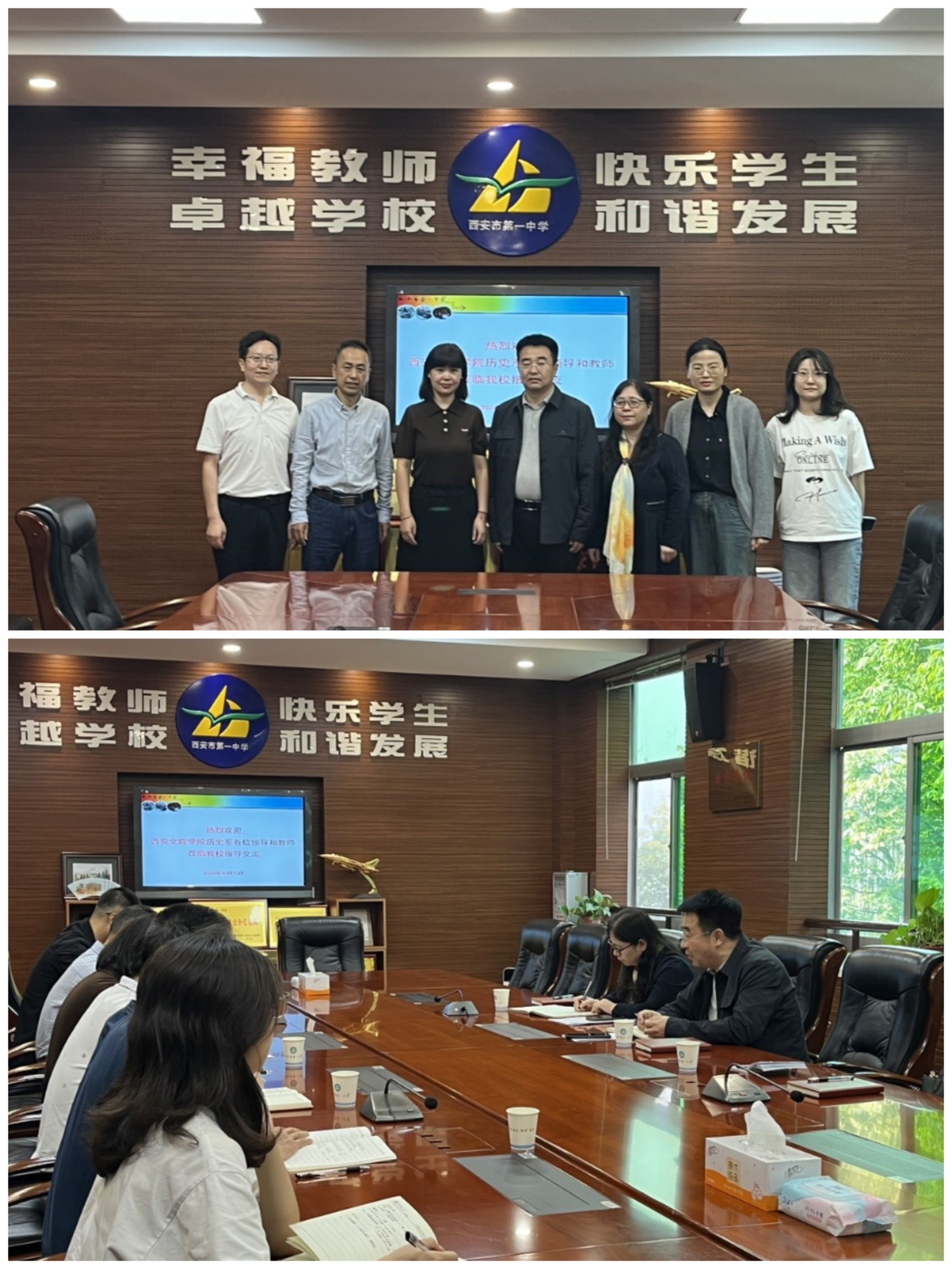 10月15日下午,公司党总支书记李东升,历史系主任王筱宁及教师代表张少娜赴西安市第一中学开展访企拓岗活动,受到该校副董事长高莹的热情接待。西安市第一中学办公室主任刘朋周、德育处副主任孙权、教学处副主任白亚东、政史地教研组长马毅坤陪同。