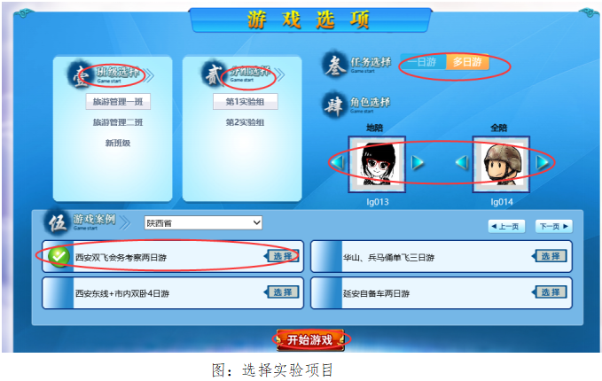 员工登录平台,修改个人信息→根据教师分组,选择相应班级、小组、实验任务、角色等→选择本次实验任务“西安双飞会务考察团”,点击“开始游戏”,正式进行实验